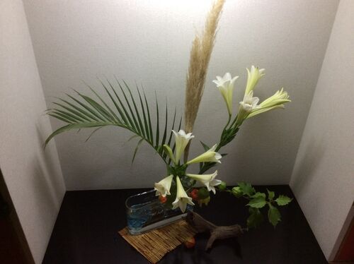 後ろの「すすき」のようなものは、ブラジル原産の「パンパス」という植物だそうです。日本の「すすき」によく似ておりますね。 下の方には「ほおずき」もあって、いつも季節感が感じられて、お花を眺めるだけで気分が良いですね!来月の、「中秋の名月」もと…